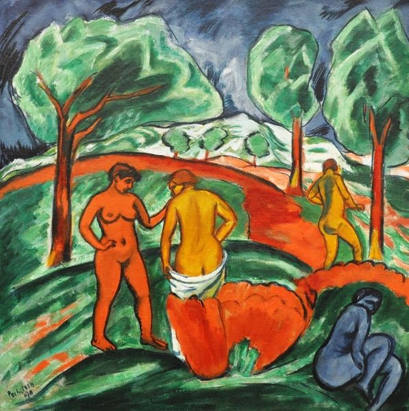 Othon Friesz painted 'Figures in a Landscape’ using an earthy palette of greens, reds and browns. The painting presents a scene teeming with human figures, merging into a landscape of trees and foliage. Friesz employs a compositional structure that balances the figures with the landscape, integrating them into the natural setting. The artist's brushwork is expressive, creating a dynamic surface where forms seem to emerge from a swirling mass of paint. The figures are generalized, their forms simplified to basic shapes that reflect the post-impressionist interest in the essential qualities of form and colour. The perspective is flattened, reducing depth and drawing attention to the surface of the canvas. Friesz seems to be engaging with the modernist project of redefining the relationship between representation and abstraction. The painting serves as a visual manifesto, questioning traditional artistic conventions and proposing new ways of perceiving and representing the world.