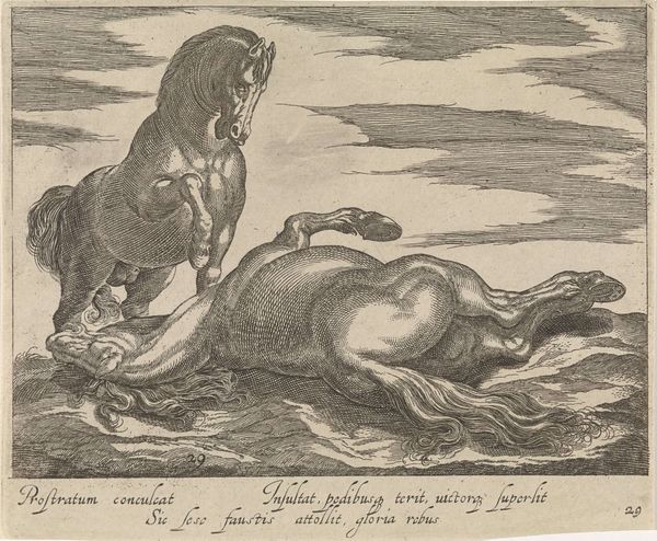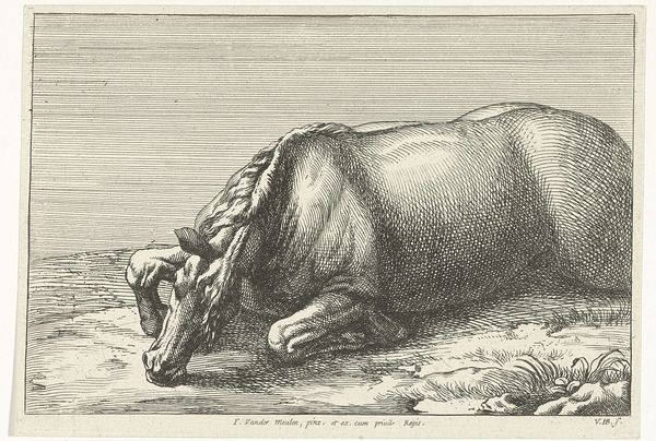 Jan van Huchtenburg created this drawing, "Two Fallen Horses Lying Behind Each Other," with pen in gray-brown ink, around the late 17th or early 18th century. The image presents a stark view of war, focusing on the lifeless forms of horses rather than heroic combat. The composition emphasizes the geometry of the animals' bodies, using line and form to convey their stillness. Notice how the stark lines create a sense of texture, particularly in the depiction of the horses' musculature and hides. Here, the artist seems less concerned with narrative and more with the formal qualities of rendering the figures. This shift reflects a broader artistic interest in exploring the aesthetic dimensions of form and representation. In its focus on materiality and form, the drawing invites us to consider the aesthetic codes through which war and its aftermath are portrayed, challenging conventional notions of heroism.