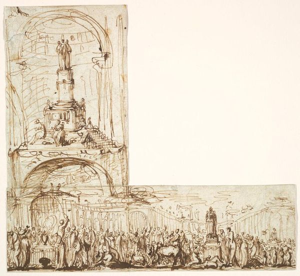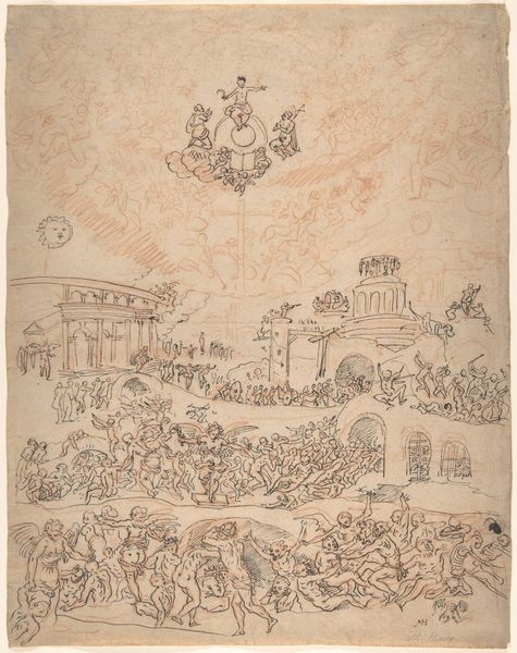 Simon Fokke created "Oproer om de sleutels, 1672" using pen in brown ink, likely sometime after the depicted events. The eye is immediately drawn to the linear details that define the forms and the composition. The drawing captures a dynamic moment, a riot perhaps, with figures arranged in a receding perspective down a street. The use of line creates texture and depth, guiding us through the scene. We see a building on the left, its architectural details rendered with precision. The riot unfolds towards the background, the figures becoming less distinct, more of a mass than individual forms. The scene is carefully constructed through lines. Look closely and you will see how the composition is grounded on horizontals from the building's ledges to the street edges. It serves to give the drawing a sense of depth. It also provides a structure for Fokke to narrate a historic moment. Fokke's drawing invites us to reflect on how historical events are visually constructed and remembered.