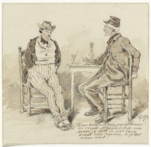 Editor: Here we have Pieter van Loon's "Karikaturale scène van een jonge man die bij een oudere man geld tracht los te peuteren," created in 1862. It's a pen and ink drawing. The figures appear quite animated; one is gesturing emphatically while the other looks rather stoic. What catches your eye about this piece? Curator: This drawing offers a fascinating glimpse into social dynamics of the mid-19th century. Van Loon's caricature captures not just individual personalities but a power imbalance. The "young man" importuning the older figure speaks to broader economic realities – perhaps anxieties surrounding inheritance, or the struggles of emerging middle classes navigating established wealth. Editor: That's interesting, I was only thinking of a general feeling but how does it reflect its time? Curator: Look at their clothing, their postures. While exaggerated, they're rooted in observations of contemporary dress and comportment. Think about the role of caricature in popular media at the time; it was a tool for social commentary, often used to critique the wealthy or powerful. Does that add another layer to the exchange between these two men? Editor: It does. I see now how the exaggerated style works to critique class dynamics instead of just being funny. Curator: Exactly! The public function of such imagery makes it interesting. Van Loon uses his artistry to depict a scenario freighted with socio-economic meaning. Editor: I hadn't considered how social commentary can be embedded within seemingly simple sketches like this. Thanks! Curator: And I am intrigued by how popular imagery could influence social relationships; food for thought!