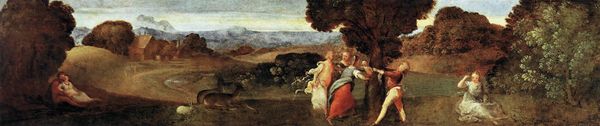 Editor: Here we have Altdorfer's "Diptych," created in 1507 using oil paint on panel. The composition, with its juxtaposition of figures against very elaborate landscapes, strikes me as unique for this period. How do you approach interpreting a work like this? Curator: From a formalist perspective, the diptych hinges on a compelling binary. Consider first the division of space; the symmetrical composition creates a dialogue between the two panels. Note how the figures’ placement adheres to clear, structured zones of activity. The tension comes from a subtle chromatic scale moving across both panels. Editor: So, you are focused on how it's constructed, how its various visual aspects relate to one another, rather than what it's "about"? Curator: Precisely. Examine how line dictates form, establishing a visual language. Light, too, plays a crucial role. Observe how the artist orchestrates shadow to generate depth. The meticulous details contribute to the painting's symbolic weight, which can be decoded as pure formalism. What of your impressions? Editor: Well, the intricate detail, like you mentioned, feels so important. The lines, the textures, everything is so carefully rendered. I hadn't thought of that detail as being part of the message, so to speak. Curator: Indeed, the materiality is central. Altdorfer's brushwork invites careful consideration of his technique and the structural properties embedded in it. Through form and method, we gain insight into the artistic decisions at play. Editor: Thanks. That really sheds new light on how I’ll approach similar works. Curator: I concur. Form should often precede, or at least inform, any conclusions about theme, at least in this work, since its cultural context might distract us from understanding the piece as a form.