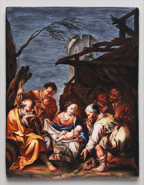 Curator: Let's spend a few minutes contemplating Juan Bautista Maíno's "Adoration of the Shepherds," an oil on canvas completed in 1614, currently residing at the Museo del Prado. What are your immediate thoughts? Editor: A sense of disjointed realities. The celestial realm seems strangely detached from the earthly one. Note how the angels are suspended almost ethereally above, while the shepherds below are rendered with this stark, almost brutal realism. It's a compelling juxtaposition. Curator: It certainly speaks to the socio-political context of the Counter-Reformation, doesn't it? There's this conscious effort to bridge the divine and the everyday, bringing religious experience closer to the masses, yet maintaining the Church's divine authority. Editor: Absolutely. And the light! Notice the way light cascades down, illuminating the Christ child. There is a focus and emphasis on Christ himself in relation to the dark surrounds, almost a chiaroscuro effect. It's used as a means of highlighting the central event and subjects. Curator: Indeed. The theatrical lighting, coupled with the highly emotive expressions, invites the viewer into the scene. This engages the devotional practice that the Church strongly promoted at the time. Note the placement of the viewers to also reinforce this action. Editor: However, observe how each figure occupies their space. They are self-contained; only connected via their shared experience rather than a direct interpersonal relation, it heightens the painting's devotional intensity, in contrast to its overt religious aim. Curator: An interesting point. I would also say Maíno uses this painting to showcase his intellectual prowess. He positions himself within artistic conversations. His masterful control of the Baroque style, the way he synthesizes realism with theatricality, signals to viewers that his art demands attention. Editor: And doesn't it get it! In a brief review I have enjoyed unravelling Maíno’s compositional strategies here. Curator: As have I looked back at its societal setting to illuminate new meanings.