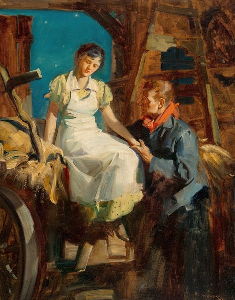 Curator: Here we have Francesco Gonin’s “A Rustic Couple,” likely created around 1862. It’s currently held at the Minneapolis Institute of Art. Editor: Oh, the texture immediately gets me – you can almost feel the roughness of their clothes. Is it an oil painting? Curator: It has qualities that feel like an oil painting, but in fact, this genre piece is more than likely made of watercolor and gouache applied on paper, offering a striking realism that plays with depth in such a subtle way! Editor: Fascinating! I'm really drawn to that basket at the lower left. It seems so intentionally placed. I find it beautiful how that mundane tool used to haul goods creates such an impact and anchors the rest of the painting to something grounded, something basic to all classes. Curator: Exactly! It adds layers of narrative – and don't you think the warm color palette chosen infuses the piece with an element of nostalgia? The slight smiles hint at something sweet being shared…maybe more than just wine? Editor: True – or perhaps that simple glass represents a rare indulgence for working people, not some great love. Their red and blue clothing seems to be their Sunday best, as though that’s what signifies celebration in their means of work. Curator: Possibly, but Gonin always captures these fleeting moments with such sensitivity, doesn’t he? He elevated these mundane scenes in Italian daily life to…art. The quality of observation seems genuine; almost as if he knows his characters. Editor: Maybe he did! Though, more than just knowing, the choice to paint in this format, as well as on paper with those material characteristics... all those were a means of production. A way to show the common working people who don't have a grand home or space in formal galleries that there is elegance to be found even with rough materials. Curator: I can see that! These simple lines become brushstrokes, blending their humanity with something divine... What a curious mixture. Thank you! Editor: Thank you, it was really nice thinking of ways to look at these images beyond the obvious. I am definitely thinking of paintings beyond the pure image of beauty now.