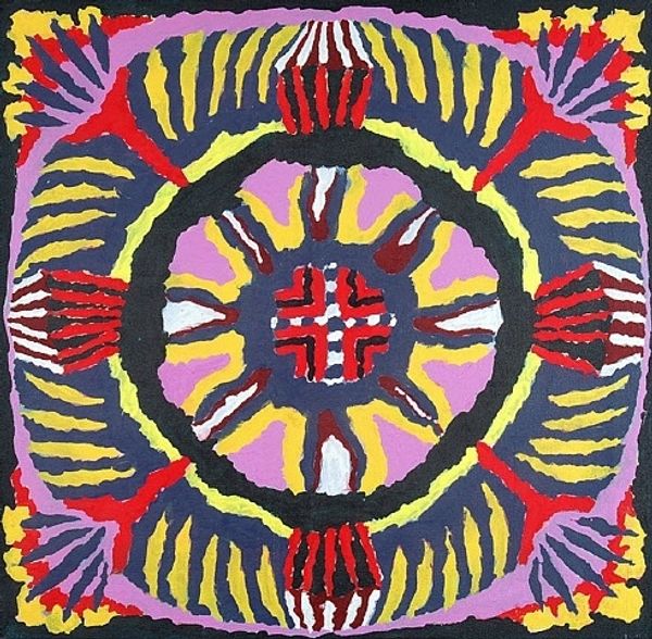 Here is Samuel Buri's 'Grille en quatre', a painting that vibrates with life through its complex, colorful geometry. The real buzz comes from Buri's application of paint; he’s built this up in layers, so the surface has real depth and texture, like a relief. It’s not just flat color, each mark feels like an individual decision, but collectively they make up a coherent whole. The yellow ground is particularly interesting, almost shimmering with the dots of complimentary colors. Looking at the center of the canvas, where the four panels meet, Buri has created shapes like kaleidoscopic flowers. Each panel of color seems to nestle against another, making the whole piece work. The geometry is almost Islamic in its detail, yet Buri’s painting feels more playful. It reminds me of Bridget Riley’s exploration of optical effects or maybe, even, some of the abstract patterns of Gustav Klimt. Buri makes us see the world not as it is, but as a field of endless possibilities.