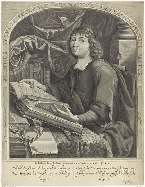 Curator: Here we have a fascinating engraving dating back to 1751, "Portret van Jan Abel Wassenbergh" by Pieter Tanjé, currently held in the Rijksmuseum collection. Editor: The piece gives off a formal but friendly vibe. The way the man is framed in that oval, along with his engaging expression, immediately draws you in, despite its size as a print. It feels intimate and performative. Curator: Exactly, and that's where the societal context becomes interesting. Tanjé was known for portrait engravings. Prints like this served an important purpose—they allowed images and ideas, including those of prominent citizens, to circulate more widely in 18th-century Dutch society. It helped to shape and disseminate public images and solidify social status. Editor: The secondary figure appearing out of focus behind him... a kind of "ghosted" effect of another self that perhaps speaks of othering... an imposed representation. Also I read something that appears as the OCR 'kanyanaren hare.' If you know of its true context it would be interesting if you knew how it refers or responds to gender and the construction of beauty ideals. Curator: That spectral presence certainly adds layers of interpretation, the "kanyanaren hare" being 'buried in the artist's heart' certainly connects to that element of subjectivity and projection on Wassenbergh's part. Looking closely, one can appreciate Tanjé’s technical skill; the textures and tones achieved with such precision on metal are quite remarkable. Editor: Yes, and think about who this portrait might have reached at the time. These weren't simply neutral documents, but tools to perpetuate class structures, with an opportunity to contest what were, perhaps, constrained perspectives and archetypes. It provokes so much further questioning. Curator: It is that very dialectic—the intention and reception that makes this piece so rewarding to unpack. Editor: A compact image brimming with social narrative, technical artistry, and historical echoes, certainly demanding a contemporary re-appraisal.