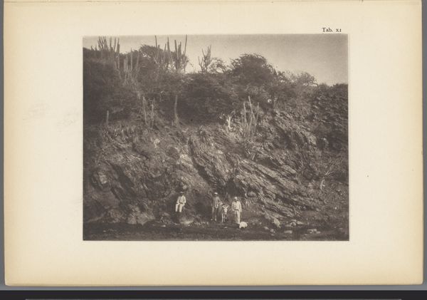 Editor: Here we have "Gezicht op een bedding van de rivier San Esteban in Venezuela," which translates to "View of a riverbed of the San Esteban River in Venezuela," a photograph from before 1887 by Jacobus Rudolphus Neervoort van de Poll. The composition really strikes me; the eye is immediately drawn to the mass of rocks in the foreground, but then lost in the dense foliage beyond. What do you see in this piece? Curator: The photographic print, even in its muted tones, presents a compelling study of contrasting textures and spatial relationships. Observe how the artist employs tonal gradation to create depth; the sharper focus on the rocks in the riverbed versus the softening of detail in the background vegetation. Consider also the relationship between the organic forms; the curvilinear shapes of the boulders opposed by the tangled verticality of the hanging vines. Do you perceive how this opposition establishes a visual rhythm? Editor: I think I do. So the contrast between the rocks and the vines creates a sense of visual balance and leads the eye through the picture plane. Curator: Precisely. Moreover, contemplate the absence of a discernible horizon line. This compositional choice serves to flatten the picture plane, thereby emphasizing the surface qualities of the photograph itself, drawing attention to the photograph's very essence as a constructed image, rather than a mere record of a scene. Editor: That’s interesting, I wouldn’t have noticed that flattening effect. The emphasis on texture rather than a grand vista does change how I see it. Curator: Indeed. It’s about reducing it to its elemental structure of tones, lines, and textures. This allows us to focus on its inherent artistic qualities. Editor: I am beginning to appreciate how a formalist perspective heightens the image’s abstract qualities, and makes you really examine the arrangement of its basic visual elements. Thanks for the insight! Curator: My pleasure. By considering these qualities, we start to really see and value it.