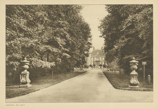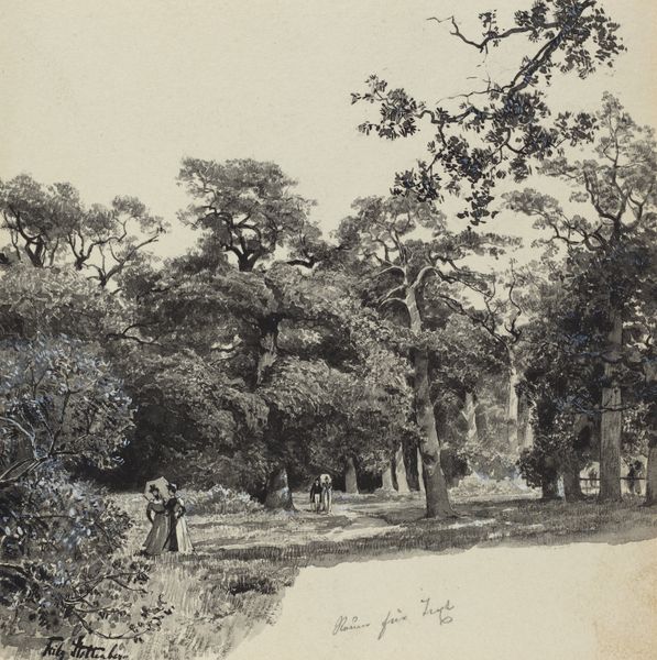 Curator: I see a dream! It's a shaded path through trees, filtered by sepia tones, like a memory surfacing... Editor: Indeed. This is a photograph from 1856, “Wood-scene, Norton, Cheshire,” made by Thomas Davies. Consider the materials – likely a waxed paper negative, developed using a process like calotype or early albumen printing. The labour involved would be considerable. Each print painstakingly rendered, not mass produced. Curator: Ah, it feels painstakingly captured too, a dedication of time. The way the light dapples… Do you think it romanticizes labour? Is it celebrating a connection to nature or obscuring the real work? Editor: That is the crucial tension. Davies’ social position allowed him the leisure to depict this pastoral scene. This intersects with the rise of industrialism and the aestheticization of nature to counter urban realities, what the art critic John Ruskin described as the ‘truth to nature’. Curator: "Truth" is a tricky word... Maybe it's truth to longing. I look at that path, and I feel a gentle urge to get lost. The photograph invites an intimate, wandering participation. Editor: Perhaps that intimacy is part of its romantic appeal. Look at how Davies utilizes plein-air techniques – quite progressive for the time. It's landscape as an artistic and material construct. Each choice affecting its value as art object or tool for societal validation. Curator: Even now, looking at the tones – the browns, grays – I imagine how deliberate that darkness is, and it feels very artistic, not just informational. More feeling than data... What lasting purpose did photographs fulfill back then, would you say? Editor: That's a question still debated among scholars. Was this intended as purely artistic expression or something closer to scientific documentation of botanical arrangements and environmental spaces that reflected social values of beauty. Its ambiguity creates tension and provides value today. Curator: Exactly. Perhaps truth is in that delicious tension then. Thank you. Editor: Likewise, our focus should extend to examining that interaction of process and subject together, considering what makes something art and why.