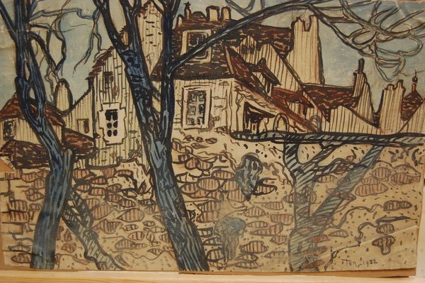 Hélène Guinepied created this watercolour painting, Chez Victoire, to illustrate a scene with nature and architecture. The overall effect is calming. The structure of the composition divides the view into three horizontal bands. The lower register is dominated by the pond, whose surface reflects the world above. The middle ground gives spatial support to the architecture sitting high above the immediate landscape. The top register is a narrow band of sky with a cool palette. The use of line throughout the artwork has a semiotic function that creates a sense of movement. For example, the lines in the water suggest ripples and the continuous flow. The painting operates as a series of signs that point towards the artist's impression of place. Ultimately, the visual language presented in Guinepied's watercolor reminds us that artworks function as cultural texts.