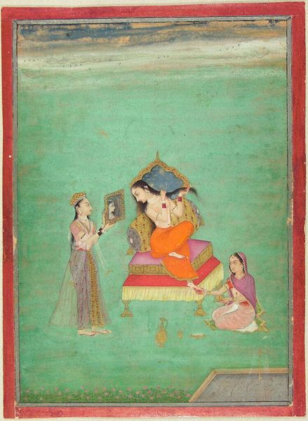 Curator: This is "Jyestha, the Month of Heat," attributed to Ustad Murad. It's a page from a Baramasa manuscript, part of a series depicting the twelve months. Editor: It has a charming, almost dreamlike quality. The pastel hues and delicate rendering evoke a feeling of serene warmth. Curator: Indeed, the composition utilizes a divided space, contrasting the interior scene of the pavilion with the external landscape featuring an elephant. Consider its symbolic value within the Mughal court, where elephants were powerful symbols of royalty. Editor: Right, and the architectural details themselves—the cusped arches, the chhatri domes—speak to Mughal aesthetics and the blending of Persian and Indian traditions. The visual weight in the upper register balances the lower one—almost perfectly symmetrical. Curator: That symmetry may reflect the balance of courtly life, juxtaposing leisure with the responsibilities of power, and the influence of the emperor on both. Editor: It’s a fascinating interplay of elements, revealing much about Mughal culture through its visual language.