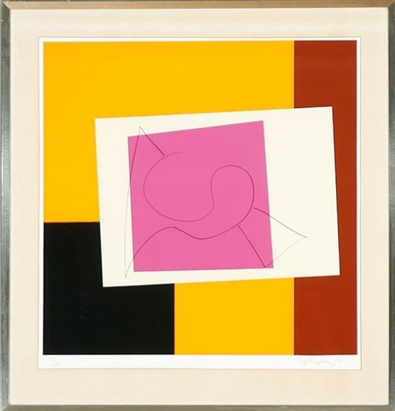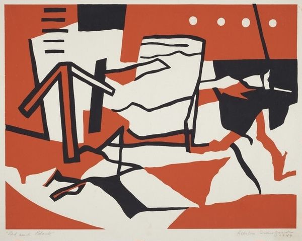 Editor: Here we have Karl Kasten's "In the First Place," a collage and print from 1969. It has an interesting tension; the composition feels very geometric, but the textures soften that rigidity. How do you interpret this work, considering its historical context? Curator: Considering the artwork's creation in 1969, we can explore its resonance within the socio-political landscape of the time. The abstract geometric forms might symbolize a deconstruction of traditional societal structures, a visual representation of the era's questioning of established norms. What role might the juxtaposition of the hard-edged shapes and the organic textures play in this conversation? Editor: That's a good point; the contrast does seem deliberate. It’s as if the artist is acknowledging the push and pull between order and chaos. What’s fascinating to me is that the Pop-Art elements seems at odds with the overall feeling of this linocut. It is not kitschy or mainstream. It’s almost subversive. Curator: Precisely. We can examine Kasten's piece through the lens of power dynamics, thinking about the linocut’s symbolic importance. Kasten might be subverting our expectations, critiquing the co-option of art for political ends and pushing us to reconsider what art can achieve as a tool of empowerment. Editor: I didn’t initially see it that way, but thinking about the era and the way abstraction can be a form of protest definitely changes my perspective. I appreciate how you situated this work within such a broader, yet very insightful, framework. Curator: Art serves as a visual dialogue that enables and enhances one’s view, not only for individual introspection but a communal call for intersectional cognizance and mobilization for those who would otherwise be voiceless. That dialogue continues today.