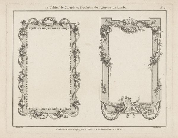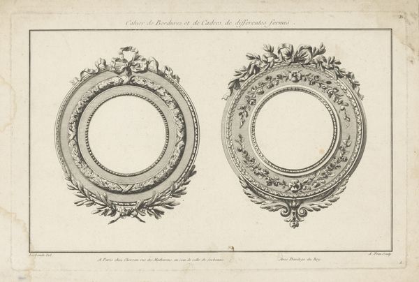 Editor: So, this is "Rectangular and Oval Frame" by Augustin Foin, dating back to 1784-1785. It's an engraving on paper, and quite detailed for what seems like a design template. I'm struck by how these frames, meant to hold something else, are so ornamented. What symbols do you see at play here? Curator: The ornamentation itself is highly symbolic, acting as a signifier of status and taste. The wreaths, the urn atop the rectangular frame, the very geometric forms...they all speak to the visual language of Neoclassicism, harking back to ancient Greece and Rome. Think about what those cultures represented: order, reason, and idealized beauty. Why choose those references to frame a picture? Editor: To elevate the subject within the frame, perhaps? To imbue it with those same classical ideals? Curator: Precisely. These aren't merely decorative flourishes. They are deliberate choices meant to influence how the viewer perceives whatever is ultimately housed inside. The choice of rectangle versus oval can be seen as another layer of meaning too. What emotional connotations come to mind with those shapes? Editor: Rectangles feel more formal, stable… while ovals are softer, more flowing. Curator: And think of the context: late 18th-century Europe. These frames were designed for a society grappling with evolving ideas about power, taste, and self-representation. They helped create visual cues, reinforcing social hierarchies, and transmitting values across generations. Editor: I see the layers now – it’s not just decoration, it’s visual messaging. Thanks for unraveling all that for me. Curator: My pleasure! Hopefully now, the seemingly simple frames act as windows into a world of cultural meaning.