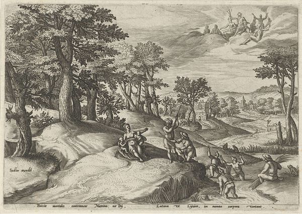 Curator: This is Johann Sadeler I's "Latona Changes Men to Frogs," currently residing in the Harvard Art Museums. Editor: My eye is immediately drawn to the transformation; the figures contorting into frogs are vividly grotesque against the serene landscape. Curator: Indeed. Sadeler, active in the late 16th century, was a master of engraving. Notice the detailed lines creating texture and depth. This print was likely made for a book or portfolio, intended for circulation among educated elites. Editor: And the image itself is laden with symbolism. Latona, a powerful maternal figure, avenges the disrespect shown to her by these peasants. Frogs themselves often represent transformation and, in some contexts, impurity. Curator: The production of such prints involved specialized labor and a market keen to consume classical narratives. This image offered a moral lesson but also showcased the engraver's skill, serving as a form of cultural capital. Editor: Ultimately, the print serves as a reminder that even seemingly powerless figures can command divine justice, transforming the mundane into the monstrous. Curator: Yes, it's a potent reminder of the social and material processes through which such stories took shape and were disseminated.