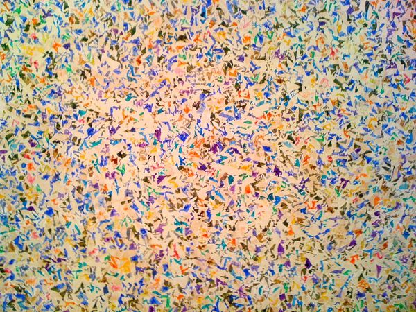David Annesley made this playful print using red, yellow, blue and turquoise marks. I like how the work feels like a record of a process, a dance of color across the page. The surface of the print is so alive with these little gestures! They're not quite dots, not quite dashes, but each one has its own energy. I think the combination of primary colours gives the piece this vibrant, almost childlike quality, like the confetti from a party. Notice the way the marks seem to be pulled into the center, as if drawn in by some invisible force, there's a real sense of movement, but then you realize, nothing is really moving at all. It's like he's caught a moment of pure, joyful energy and pinned it down on paper. It makes me think of Bridget Riley's Op Art, the way she plays with your perception, and how Annesley too, understood that art is an ongoing conversation. You look, you respond, and you add your own voice to the mix.