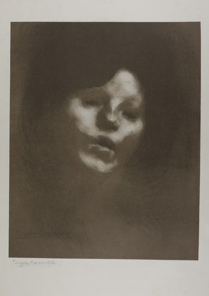 Editor: Eugene Carriere's portrait, Nelly Carrière, is captivating, with its muted tones and soft focus. The subject seems to emerge from a dream. How do you interpret the symbolism at play here? Curator: The limited palette and hazy atmosphere evoke a sense of memory. Notice how the face is the most defined area. What do you think that focus conveys about the artist's intent? Editor: Perhaps it suggests the enduring power of memory and emotion, even as details fade? Curator: Precisely. Carriere often used this technique to express psychological depth. It’s as if he's painting the essence of Nelly, not just her likeness. Editor: I see it now – it's about emotional resonance more than precise depiction. Thank you.