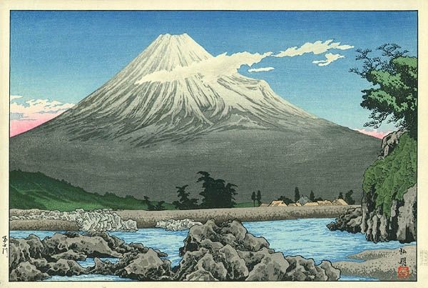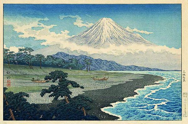 This is Fuji from Kurasawa, a woodblock print by Shotei Takahashi. What I like about it is the kind of in-betweenness of everything. It's not quite one thing or another. Look at the surface of the water, where the blue flattens out into a kind of all-over pattern, like a color field painting. Then you have these dark, almost gothic trees in the foreground, these verticals that pull you back into a more perspectival space. It’s like a stage set, or maybe a screen. There's also this funny little sailboat, a tiny white triangle amidst all that moody atmosphere. The whole thing is rendered so flat, but there’s also this real depth created by the gradations of color in the sky and the mountain. It reminds me of Arthur Dove’s landscapes, that same sense of capturing a fleeting moment, a feeling. Like with Dove, it’s not about a literal depiction of a place, but about the sensation of being in it.