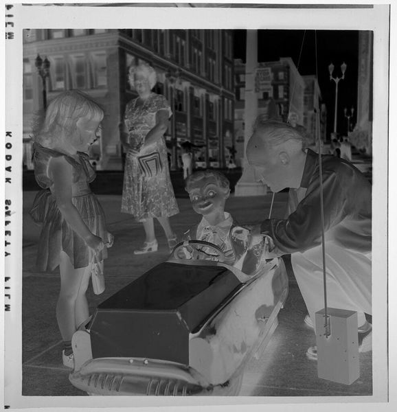 Editor: This is an untitled photograph by Jack Gould, showing people at a gas station. It’s a simple, everyday scene, but the negative processing gives it an eerie quality. What can you tell me about this image? Curator: The inversion certainly emphasizes the materiality. Look at the textures: the slickness of the Mobil oil sign, the rough concrete of the pump, and the fabric of the clothing. The process brings all these materials to our attention. How does this relate to the context of everyday life at the time, to labor, and consumption? Editor: I hadn't considered that before. Thanks! Curator: It highlights the socio-economic factors influencing daily routines. Food for thought.