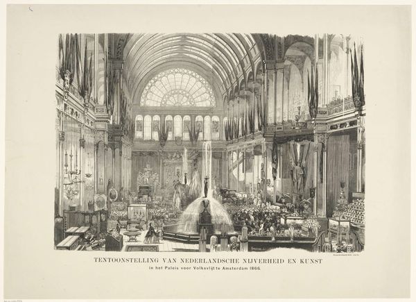 Editor: This engraving by Frederik Hendrik Weissenbruch, made sometime between 1859 and 1861, depicts the grand hall during an exhibition. It feels very documentary, like a snapshot of a cultural event. What can you tell me about the significance of depicting exhibitions in art? Curator: It’s interesting you call it a snapshot. Engravings like this served an important role in disseminating information and shaping public opinion about art and culture. Consider the context: increased literacy rates, the rise of the middle class, and a growing interest in art. How did these engravings democratize art? Editor: I guess by making art accessible to a wider audience through print, rather than exclusive access only by seeing it in person or if you are part of an elite circle? Curator: Precisely! Engravings such as this documented exhibitions, presenting them to those who couldn’t physically attend. Think about how these images would circulate – in newspapers, journals – becoming part of public discourse. Editor: So it's not just a picture, but an artifact that reflects the changing social landscape. It feels almost like an early form of social media. What do you find most interesting about this piece? Curator: I'm drawn to the interplay between art, the public, and the institutional spaces that showcased it. This engraving provides insight into the political dynamics of art display and the efforts to construct a national identity through art. Notice how people are presented and where the point of view places us in the scene. Who has access? What are they looking at? Editor: It's fascinating to consider this engraving as more than just a depiction of a room, but also about how art institutions presented themselves to the public and influenced society’s values. Thanks for highlighting the cultural context, it shifts the whole perspective. Curator: Indeed. Looking beyond the image itself towards its historical reception and the cultural forces at play gives it meaning.