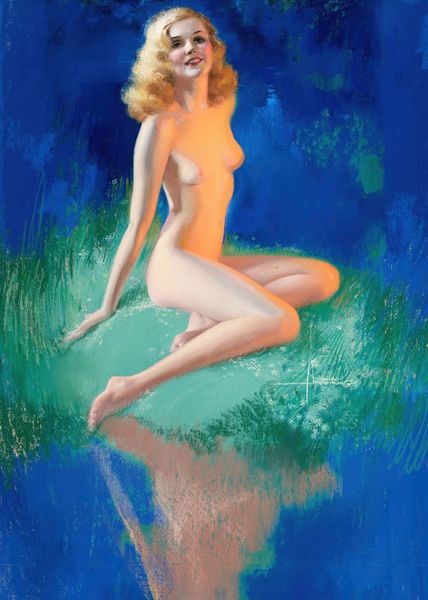 This artwork, titled "Let's Be Friends," was created by Rolf Armstrong, though we don't have an exact date. It seems to be made with pastels. Armstrong was a master of the medium, celebrated for his illustrations of women. Armstrong’s art was for mass consumption. His approach reflected a streamlined method that reduced labor, typical of commercial art at the time. Instead of spending endless hours on a single canvas, the artist worked efficiently, ensuring a steady stream of images for magazines, calendars, and posters. The pastel medium allowed for swift application and blending, ideal for capturing soft skin tones and the overall smooth finish demanded by commercial tastes. Armstrong employed techniques that prioritized visual appeal, mass production, and meeting the demands of a growing consumer culture. The final product is far from a traditional painting, existing more as a printed image, designed for distribution. This piece asks us to reconsider the relationship between art, labor, and consumerism.