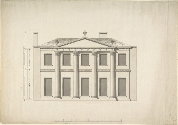 Editor: Here we have an architectural design drawing—Architectonische ontwerptekening van een classicistisch woonhuis—penciled around the 18th century, likely by C. Taselaar. Its imposing symmetry gives a feeling of formidable, if somewhat austere, elegance. What strikes you most when you look at this drawing? Curator: Elegance, absolutely. It’s more than just a house; it's a statement, wouldn’t you say? A testament to the values of Neoclassicism; the emphasis on symmetry, order, and, dare I say, civic virtue! Notice how the artist, Taselaar, used such precise lines to evoke such an...unfussy grandiosity? Editor: Yes, those windows almost stare back at you, unblinking! The severe shadows really accentuate the blocky geometry. I can almost *hear* the polite conversations taking place within its walls. Curator: Precisely! Shadows aren't just about depicting light, darling; here, they define the very *bones* of the building, emphasize its unwavering structure! I wonder, does it feel impersonal to you, too? A building that perhaps values decorum above domestic coziness? Editor: A bit, yes. I get a sense of it being more of a monument, but those busts flanking the entryway give it a sort of...personality. Are those common architectural features? Curator: The busts are interesting, aren't they? Common in palatial homes, of course, and perhaps a way of injecting some *life* – or at least, representations of life – into what might otherwise feel like an unyielding, geometric statement. This house almost feels like a stage for historical dramas to play out, don’t you think? Editor: It does now that you mention it. I'll never look at a cityscape the same. Curator: And isn't that the beauty of it all, my dear? A simple sketch transporting us to stories untold, perspectives unforeseen! It whispers secrets of generations past.