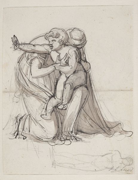 Curator: Here we have Samuel Woodforde's "Study of Two Children in 'The Bennett Family'," currently held in the Tate Collections. Editor: It's a captivating sketch! The minimal lines and simple forms evoke a sense of lightness and spontaneity, as if capturing a fleeting moment. Curator: Woodforde, active in the late 18th and early 19th centuries, lived in a society deeply stratified by class. How might this dynamic have shaped the childhoods of the Bennett children, influencing their representation here? Editor: Note the economy of line—observe how he suggests form and movement with just a few strokes. The blank background pushes the figures forward and emphasizes their interaction. Curator: Perhaps Woodforde is subtly commenting on the performative aspects of childhood within the rigid social structures of his time. It is a reminder that childhood itself is never a neutral space. Editor: Indeed. In its purest form, it's a masterclass in suggesting form. Curator: A glimpse into a world both intimate and mediated by social forces. Editor: A compelling exercise in form.
