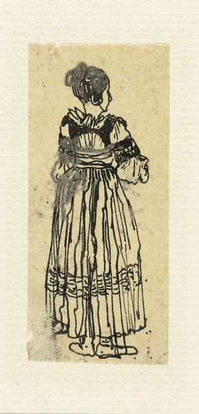 Curator: I find this ink drawing titled "Evening Creation," attributed to Erte, rather elegant. The monochrome palette really accentuates the intricate detail. It feels timeless. What’s your first take? Editor: The stylized form immediately reads as Art Deco. There’s a kind of glamour present, but it's undercut with a tension. Is she being adorned or trapped by this opulent dress? The question feels really timely. Curator: Yes, there's a certain ambiguity. The circular motifs repeated in her muff and the trim of the coat remind me of cyclical patterns in nature and the cosmos—creation, destruction, and renewal— perhaps mirrored in fashion cycles themselves. Editor: It speaks volumes, doesn't it? I see a commentary on the constructed feminine ideal of the period, the dress acting almost as a cage, restricting movement even as it enhances perceived beauty. What freedoms are women trading for this sort of aesthetic appeal? Curator: Fascinating! For me, the dress and her pose bring forth themes of transformation, masking, and adornment in cultural rituals. Fashion often serves as a visual language, articulating status and belonging, though the language itself might transform throughout the eras. Editor: Definitely. And consider how the sleek lines, while graceful, can also suggest uniformity, perhaps reflecting anxieties of mass culture creeping in between the wars and impacting the role of women in modern society. The roaring 20’s also had to accommodate an evolving role for women that extended beyond fashion. Curator: It’s as if Erte captured that precise historical pivot through the drawing. She's beautiful, refined, yet somehow distant. Editor: Agreed. There is an uneasy tension. It speaks to broader questions about beauty, agency, and the performance of femininity—topics that continue to resonate deeply within our own moment of history. Curator: Indeed. It seems fashion, even in static form, continues to invite such introspections, and reveal changing beliefs through evolving forms. Editor: A stark reminder that visual beauty can be both liberating and constraining, a point worth dwelling on in our very image-conscious moment.