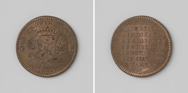 Editor: Here we have a Dutch cent from 1823, featuring Willem I, King of the Netherlands. It's a copper coin and has quite a stately, austere feel to it. How would you approach this piece from an art history perspective? Curator: Consider the coin as a product of specific economic and social conditions. The materiality of the copper itself is crucial; where was it mined? How was it processed? Think about the labor involved in producing thousands of these coins. That repetitive stamping and the distribution, that’s where the value truly lies. How does the production of currency affect ideas about value? Editor: So, beyond just being a portrait of the king, the coin tells us something about labour and economics? Curator: Exactly. This isn't just an image; it's a physical manifestation of power and trade. What were the major exports of the Netherlands at this time? This coin facilitated those transactions. The crown imagery also alludes to the exploitation connected to those trades at this period. The coin naturalizes that order through its aesthetic presence. Editor: That's a really interesting perspective. I hadn’t considered the material and labour aspects so directly linked to the coin’s significance. Curator: Precisely. By looking at the production process and material reality of this coin, we get a far richer understanding of its cultural value beyond the purely aesthetic. Hopefully, it prompts us to be more critical of the materials around us, and where they originate from.