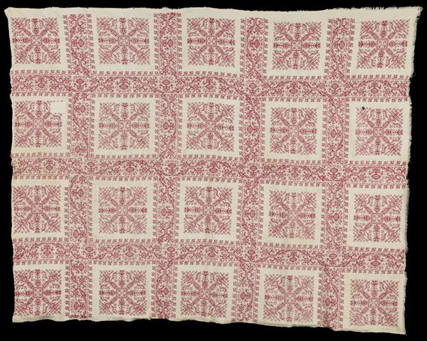 Editor: Here we have a woven silk shawl, probably from the 19th century and of unknown origin. I find its geometric pattern quite striking, but the color palette seems subdued. What visual narratives do you perceive in this textile work? Curator: Immediately, I am drawn to the visual language employed – the repeating paisley motifs. The paisley, of course, isn't simply a decorative element. It originates in Persia, where it represented life and fertility, making its way through the Silk Road and eventually into European textiles. Do you see how its symbolic weight shifted and transformed across cultures and time? Editor: That’s fascinating! I hadn't considered the movement of that symbol across such a vast geographical area. But within this shawl, does that symbol still communicate ideas of fertility? Curator: Perhaps not directly, but I wonder, if we consider the act of wearing a shawl—as a symbol of protection, warmth, even status—can we imagine the paisley as hinting at ideas of security and well-being? How does that resonate, knowing the symbol's historical meaning? Editor: So, the arrangement of the paisley within the grid, juxtaposed with those floral elements – it creates this interplay between tradition and adaptation, doesn't it? Almost like the pattern is encoding cultural memory! Curator: Precisely! It also showcases the capacity of design not only to be aesthetically pleasing, but also to silently carry meaning across generations, adapted, renewed, and subtly, changed. Editor: I had initially thought it was just a pretty pattern, but it seems there’s much more layered in those repeated shapes. Thanks! Curator: It's the beauty of art – that symbols continue their silent work, weaving tapestries of connection, even without us fully grasping their origins.
