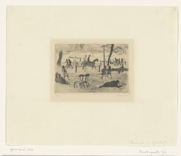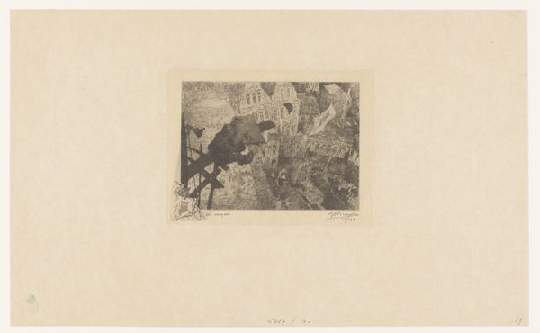 Curator: This photographic print offers us a glimpse of the fresco "Trionfo della Morte," or "Triumph of Death," located in the Camposanto in Pisa, Italy. This photo reproduction likely dates from between 1851 and 1900. Editor: It feels almost ghostly. That sepia tone gives the scene a kind of distance, like we’re looking at a memory or a faded dream about the plague. There's so much happening, it's visually overwhelming. Curator: Indeed. The original fresco, attributed to Buonamico Buffalmacco, was created during the 14th century. It’s a significant artwork because it visually captures the social and political anxieties of a society ravaged by plague and economic hardship. We should see it as a commentary on class, divine judgment, and mortality. Editor: Definitely. It's split into these different registers of suffering. You have the piles of corpses, which feels ripped straight from someone's nightmare, and then, bizarrely, there are these aloof-looking aristocrats who don't seem to notice any of it. Curator: Precisely. And then, looming over it all is Death herself, or rather, the allegorical figures associated with death, raining down destruction. There's a sense of inevitability to it, that death doesn’t discriminate between rich or poor. It uses powerful visual language to address inequality, wouldn't you say? Editor: Oh, for sure. Though even in the photographic reproduction, that symbolic weight kind of flattens out. Maybe because the chaos feels staged. Do you get what I mean? Like the composition, all the winged demons—it borders on theatrical. I'd be curious how this was displayed and regarded back in the day! Curator: Absolutely, understanding the display context—the Camposanto itself and its function as a burial ground—is crucial. Placing the "Triumph of Death" in that setting underscores the memento mori tradition, prompting viewers to reflect on their own mortality and the transience of earthly life. The layered class dynamic is definitely worthy of discussion today, because it brings forward the discourse around who is spared when catastrophe occurs. Editor: I suppose that's the grim staying power of the piece! It feels relevant now in ways I wish it didn’t. Curator: Precisely. Art like this encourages those critical conversations about then and now, and about those inequalities we keep grappling with. Editor: And what's captured here—that morbid theatricality, the fear, that desire to forget mortality—says so much about the people viewing it.