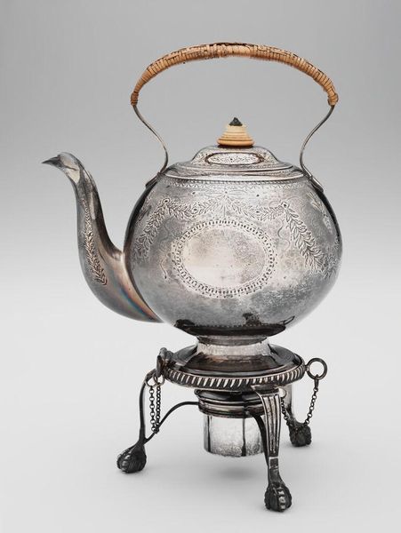 This exquisite tea kettle, crafted by Peter Behrens, stands as a testament to the enduring power of symbols in design. The kettle, with its burnished gold finish, immediately evokes associations with wealth and sophistication, reminiscent of ancient royal vessels. Note the vertical striations covering its surface; these markings recall the organic patterns of growth, echoing the natural world and perhaps symbolizing prosperity and vitality. We see similar patterns in ancient Egyptian art, where stylized depictions of reeds and plants adorned tombs. These suggest a deeper connection to life's cyclical nature. Even the handle, crafted with woven wicker, harkens back to basic human needs and the elemental act of gathering and preparing nourishment. Think of the countless iterations of this simple form throughout history, from humble clay pots to ornate silver teapots. It's a potent reminder of our shared humanity, a symbol of warmth, hospitality, and the comforting ritual of sharing a cup of tea. It embodies a profound sense of continuity that persists through the ages.