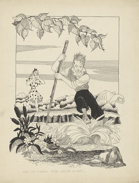 Curator: Here we have Jacob Pieter van den Bosch’s 1895 ink drawing, an illustration for Shakespeare’s King Lear, specifically depicting Lear during the storm scene on the heath. What are your first impressions? Editor: Overwhelming bleakness. It’s the stark contrast, all black and white, and that driving rain suggested by those relentless diagonal lines. Lear looks utterly exposed, not just to the elements but emotionally. Curator: Van den Bosch's use of stark symbolism is very effective. Consider Lear's near-nakedness, clad only in sandals and a light tunic beneath his cloak. What could that signify? Editor: Well, his vulnerability is obvious, isn't it? The storm reflects his inner turmoil and descent into madness. We often see nature mirroring the emotions of characters during moments of high drama throughout history. It asks, 'what is man, stripped bare of power and pretense?' Curator: Precisely. The desolate landscape itself mirrors Lear's fractured kingdom. That gnarled tree next to him almost seems to mock his posture. Do you think the social context in the late 19th century influenced this stark, almost despairing portrayal? Editor: Definitely. This was a time of great social upheaval, growing anxieties around industrialization. It reflects the era’s sentiment that systems of power—represented by Lear’s kingship—are susceptible to violent breakdown. It’s worth remembering that theatre at the time provided some political commentary on wealth and status. Curator: I agree. And beyond the overt social commentary, there's a raw psychological power. Lear, in that moment of abject vulnerability, has become every man. I see in the image cultural memory and continuity expressed in its exploration of power and vulnerability across the ages. Editor: I appreciate the way Van den Bosch's piece places the character and political turmoil directly within a landscape. We consider that art also gains power when we view them through our modern context. Curator: A great point, considering this drawing still echoes in contemporary discourse on leadership and personal identity. It is bleak, powerful, and open to fresh discourse even after more than a century. Editor: A somber reflection that, sometimes, our inner and outer worlds collide in dramatic fashion, producing some striking imagery.