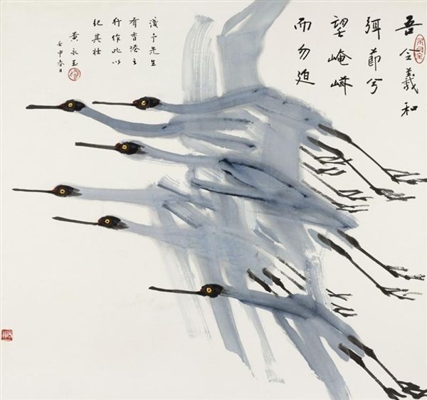 Huang Yongyu gave us these Cranes with ink and color on paper, and you can feel the speed of his brush as it darts across the surface. He's not trying to trick you into thinking these are real cranes. He’s showing you how they move, how they gather together. The thing about ink is that it's so immediate. Once it’s down, it’s down. And Yongyu really understands that. Look at how the pale blue washes give the bodies shape, but also a sense of lightness, like they could float away any second. Then you have these sharp, black beaks, like exclamation points that punctuate the whole scene. Each crane has a piercing stare, a single yellow dot for an eye that gives them a lively attitude. Yongyu reminds me a bit of Joan Miró, both capturing a sense of playful simplicity, and hinting at something deeper, something just out of reach. Art is a conversation, after all, and Yongyu is adding his own unique voice.
