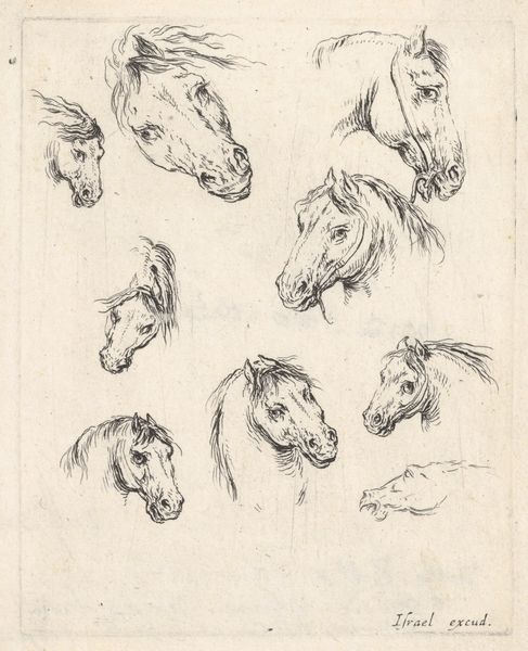 Editor: This is a pen and ink drawing of animal heads by Abraham Cooper. It’s a study sheet, and I’m struck by how each animal seems to embody a different aspect of character. What symbols do you see here? Curator: Well, think about it: in Cooper’s time, the horse, often bridled as we see here, symbolized harnessed power and nobility. The donkey, traditionally associated with humility or stubbornness. What do these animals evoke for you when seen together? Editor: I see the farm, of course, but also, a hierarchy of labor and value, maybe even a social commentary on rural life. Curator: Precisely. These seemingly simple animal studies become potent symbols, reflecting societal structures and values. The artist uses cultural shorthand to create an impression. Editor: I’ve never thought of animal studies in this way before. Thanks! Curator: A fresh perspective is always welcome.