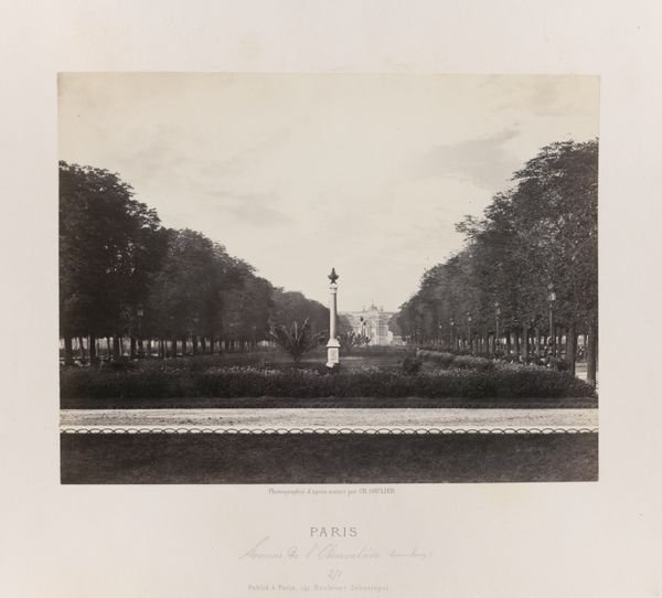 Editor: So, this is "Gezicht op de Tuilerieën," or "View of the Tuileries," an engraving by Jean Jacques Champin, made sometime between 1828 and 1860. It gives such a grand, almost cinematic view of the gardens, even though it's just black and white. It kind of reminds me of a stage set. What catches your eye when you look at it? Curator: Oh, "stage set" is such a perfect way to describe it. It’s theatrical, isn’t it? For me, it’s all about the light, or perhaps more accurately, the dance of light and shadow. Champin really captures that airy quality, which is especially evocative given it’s an engraving, where you have to suggest light by, essentially, removing it! Doesn't the whole composition have a dream-like quality? The way the city just melts into the sky... Editor: It does feel like a memory. The details fade the further back you look. All the little figures are almost blurry, like they are ghosts in the garden. Does the black and white medium contribute to the Romanticism style? Curator: Absolutely! Think about it: Romanticism thrived on emotion and the sublime. Black and white inherently strips away the literalness of color, forcing the viewer to focus on form, tone, and yes, emotion. It asks us to feel the *idea* of the Tuileries, rather than just see them. And personally, I am quite fond of Romanticism so my idea may be influenced. Editor: I see your point. I was so focused on the actual place; it makes sense that the focus would be on evoking the feeling of being there. Curator: Exactly. It's not about documentation; it's about conjuring. That whisper of history… It certainly changed my perspective. Thank you.