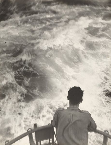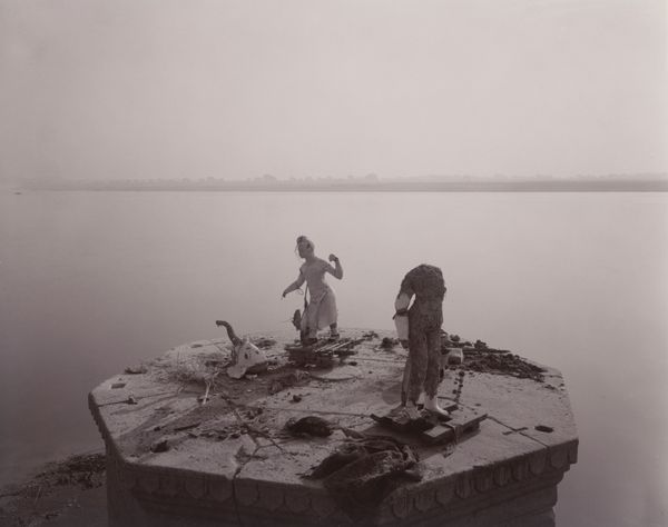 This is Robert Frank’s photographic print, *Mississippi River/St. Louis.* The composition centers around a solitary figure facing the river, framed by wooden posts and thorny branches. Its monochromatic palette and grainy texture evokes a sense of stark realism and introspection. Frank’s approach to composition and form creates a complex interplay of signs. The river acts as a symbolic divide between foreground and background, subject and environment. The figure, with his back turned, becomes a signifier of anonymity, of contemplation. Note how the thorny branches introduce a textural contrast, their sharp lines mirroring the roughness of the stones, destabilizing any sense of harmonious balance. The photograph subtly challenges fixed meanings by prompting reflection on themes of isolation and the human condition. In the end, the very act of framing—the photographic choices Frank made—serves to construct a narrative, inviting us to consider the layers of meaning embedded within the image.