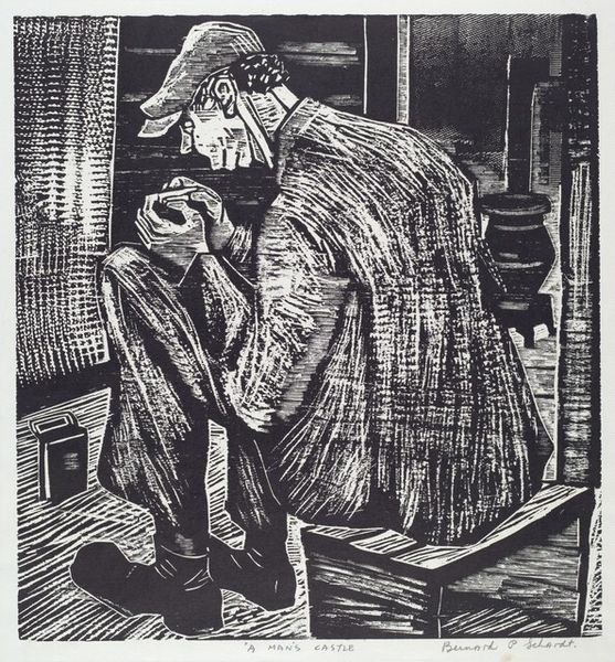 Curator: Welcome. We're looking at Vasile Dobrian's graphic art piece, "Retired", executed in woodcut printmaking. Editor: It immediately strikes me as intensely somber. The stark black and white contrast lends a grim, almost fatalistic feel to the scene. Curator: The monochrome palette emphasizes form and texture. Note the strategic use of negative space to define the subject – a figure on crutches, framed by industrial elements. Editor: Indeed, the industrial backdrop towering over the figure becomes a commentary on dehumanization. It highlights the individual's vulnerability against a backdrop of mechanized labor. The factory becomes a visual metaphor for social forces impacting individual lives. Curator: Observe how the rigid lines of the industrial landscape contrast with the organic, almost labored lines of the figure. There's a compositional tension between the geometric forms above and the faltering steps below. Editor: I would interpret that visual tension as representative of the struggle. Is it fair to interpret this piece as Dobrian alluding to labor conditions or worker exploitation within a socialist framework? Curator: The themes lean heavily into figuration and history painting. Its clear visual language positions it within a narrative of societal commentary which links the history to the people impacted. Editor: To expand that even further: It brings the silent histories of the injured and disenfranchised into focus. I find myself dwelling on that single, broken body carrying the burden of sacrifice. Curator: The artist forces us to consider the legacy and lived realities intertwined in our rapid industrial progression. The strategic formalism guides our view and lends us a certain interpretive narrative. Editor: It seems that Dobrian forces a painful acknowledgment that even with societal progress, individuals still carry very deep scars. I think that acknowledgment makes it an urgent, and maybe even ageless, piece of art.