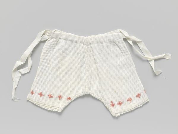 Editor: Here we have a “Luierbroek van witte katoen,” or “Diaper Pant of White Cotton,” made sometime between 1905 and 1910. It's humble, practical, yet… strangely beautiful? How should we interpret such an everyday object as a piece of art? Curator: Well, isn’t that the crux of it? The extraordinary in the ordinary. Think of those buttons – each one a tiny sun in a vast universe of usefulness! It whispers of intimism, of the quiet moments in the nursery. It also has echoes of decorative art. But more than that, I sense the quiet care imbued within each stitch. M. Insinger has imbued this garment with so much history, it's incredible. Tell me, what feelings does the fabric evoke in you? Editor: Honestly, a sort of nostalgic tenderness, mixed with an odd sense of constraint! You can see that even something so basic involves intricate design...those precisely placed buttons, the trim. Do you think there's a social commentary woven in here, pardon the pun? Curator: (chuckles) Perhaps! Or maybe it is, in essence, pure design. The attention to detail is rather wonderful. This seemingly mundane thing touches upon broader issues - labor, materials, childcare. Do you think it would have the same effect if rendered in, say, silk? Editor: Oh, that would drastically alter its message. The cotton feels so… grounded, basic. Silk would scream luxury, which changes the conversation entirely! Curator: Exactly. It shows us that true art isn't always about grandeur, but about intention and resonance. This humble garment resonates, doesn’t it? Editor: It really does. Who knew diaper pants could spark such a discussion! Curator: Art sneaks up on you like that, doesn’t it? Makes you rethink everything you thought you knew.