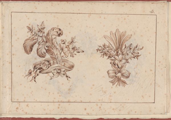 This is page five from an album of jewelry designs, delicately rendered in ink on paper by an anonymous artist. Reflecting the aesthetic sensibilities of its time, this album page offers a glimpse into the intimate world of personal adornment and social identity. The floral motifs and symmetrical compositions speak to the values of elegance. As jewelry often signified social status and personal expression, these designs also point to the aspirations and self-conceptions of those who commissioned and wore such pieces. Think about how the absence of a known artist invites questions about authorship and the roles of artisans in crafting objects of desire and identity. How might the cultural meanings embedded in these designs resonate with contemporary understandings of adornment and self-presentation?