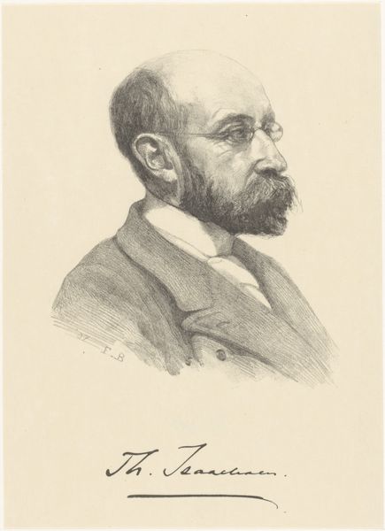 Curator: What strikes me first is the immediacy of this pencil sketch. It has a certain raw, vulnerable quality. Editor: Indeed. What we have here is a work entitled 'Portret van Willem C. Bauer.' We believe it was created sometime between 1875 and 1938 by the artist Rinus Reus. The medium is simply pencil on paper, a portrait drawing, quick but effective. Curator: Effective is a good word. There's a directness in the gaze, almost confrontational. He appears a figure burdened by the weight of his time, his context. I’m drawn to the possibility that this was a work made during times of socio-political unrest and its symbolism for Bauer during that period. The rough pencil work enhances that feeling of disquiet, of unease. Editor: The style, of course, speaks to a longer tradition of portraiture, think of the ways artistic institutions often reinforced ideas about class and authority, particularly in commissioned works, but here, we see something rawer. What stories can we glean through his rendering on paper? Did this person carry social or political influence? Was he well liked in social circles or was this merely a representation of some sort of artistic endeavor? It may be that these were the type of persons this particular artist socialized with. Curator: Precisely! It’s these power dynamics that are intriguing to contemplate. Did the artist attempt to capture Willem Bauer's essence, and if so, what particular features were deliberately included and excluded to portray this individual and promote, maintain or influence some implicit social message. The interplay of identity, representation, and authority is ever present. Editor: Absolutely. It’s always about more than just capturing a likeness, but is it a moment that freezes a part of Bauer that we may or may not ever get to experience? Curator: Exactly, and that's what compels me. Even in its simplicity, it reflects those societal mirrors—making this image so lasting and significant to understanding our collective histories. Editor: A wonderful note to end on. Thanks.