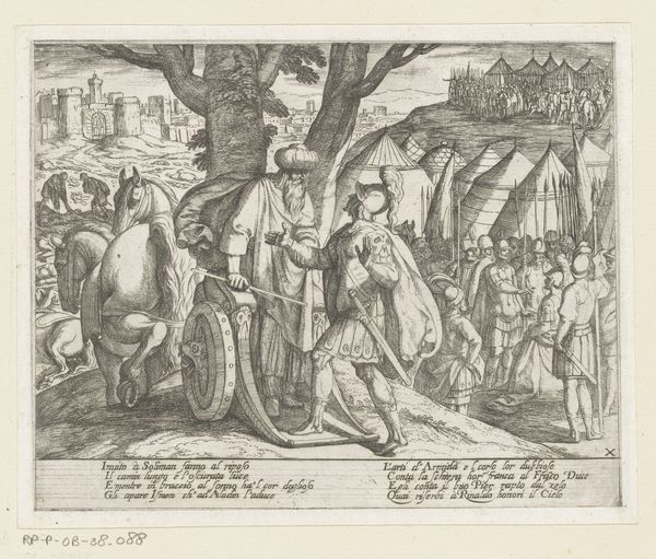 Editor: This engraving, "Heilige Antiochus als kluizenaar" by Thomas de Leu, is from after 1598 and depicts Saint Antiochus on horseback traveling with an attendant through a forest. It's amazing the level of detail you can get with just lines! The text at the bottom must have something to do with the story. What catches your eye when you look at this print? Curator: Well, beyond the exquisite line work typical of engravings from this period, what immediately grabs my attention is how this image reflects the socio-political role of religious imagery in the late 16th century. Here, we have a saint, traditionally associated with healing and protection, being depicted in what looks like a genre scene or even a history painting, as opposed to traditional portraiture. It seems designed for wider distribution. What do you make of this shift? Editor: I guess it makes it more relatable? Like, putting the saint in a recognizable landscape does bring him down to Earth, makes him feel closer to the people who would see the image. Curator: Exactly. This brings into play the context of the Counter-Reformation, right? Religious art became a key tool in reinforcing Catholic doctrine, engaging emotions, and combatting Protestant criticisms. This scene may function as a way to bring religious figures to life, reaffirming faith through a digestible and appealing visual narrative. It is like the early use of PR tactics. Editor: PR tactics! That makes so much sense. Is that why it focuses on such a humble moment instead of a grand miracle? Curator: Precisely. It speaks to a more intimate and human portrayal, making Antiochus’s journey and eventual sainthood feel more achievable and relatable for everyday people, while visually emphasizing traditional hierarchical societal relations via the interplay of the three figures depicted. Editor: Wow, that changes how I see it. I was focused on the technique, but the print is really a cultural artifact, reinforcing the power structures. Curator: And remember, that visual language, even seemingly simple compositions, reflects larger socio-political agendas. That's where art history gets really interesting, for me anyway!