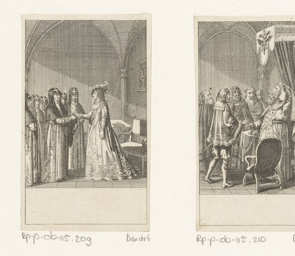 Curator: I’m immediately struck by the stark contrast and deliberate linearity of this image. The figures are delineated with precise strokes, almost as if defining shapes more than people. Editor: Yes, this double image portrays the marriage of Frederika van Pruisen and Frederik van York, created in 1792 by Daniel Nikolaus Chodowiecki. The engraving is currently housed at the Rijksmuseum. Curator: The dueling compositions—one vibrant and celebratory, the other restrained—effectively bracket the social performance of marriage. It’s fascinating how the artist employs different settings. Editor: On the left, we see the wedding ceremony taking place. Figures are clustered tightly together, the space almost suffocating. On the right, a more formal arrangement, perhaps an earlier meeting? The power dynamics in each setting are certainly pronounced. Note the architecture, with a bare, gothic, vault for the encounter on the right, set apart from the candelabras, canopies, and other signifiers of luxury and aristocracy. Curator: Consider the engraver’s process: building up forms with lines of varying thicknesses, creating light and shadow, depth. The level of detail in their costumes is astonishing. These fabrics aren’t just cloth, they delineate class, wealth, and status through visual symbols. Editor: Absolutely. These weddings served crucial diplomatic purposes, fortifying alliances between powerful European houses. The print’s very creation reflects its function as political propaganda—circulated to a wider audience, reinforcing established hierarchies. Curator: It's compelling to think how an everyday individual during this time might engage with such imagery, absorbing its underlying codes. Though the romanticism is evident, with heightened emotion surrounding a special ceremony, it is all very restrained. Editor: Ultimately, viewing Chodowiecki’s engraving offers us not only a glimpse into an 18th-century marriage, but into the socio-political systems at play within and beyond that union. It reminds me to be constantly aware of the powers at play when viewing these materials. Curator: For me, it remains a complex dance of line, form, and spatial arrangement, speaking to broader ideals in compelling material terms.