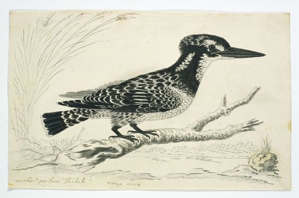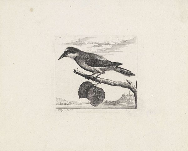 Curator: Here we have an etching by Francis Barlow, dating from the 17th century, currently held in the Tate collection. It's a small image, depicting a bird perched on a branch. Editor: Ah, I love how spare it is! The bird seems so delicate against that etched sky. It feels both scientific and a little whimsical. Curator: Barlow was known for his detailed animal studies, and this piece reflects the growing interest in natural history during that period. Editor: And the bird itself—so meticulously observed! I wonder what it felt like to draw each feather with such care? Almost like a meditation. Curator: His works often served as visual records, contributing to the scientific understanding of the natural world. The politics of imagery were heavily influenced by the expansion of knowledge. Editor: It makes me appreciate the beauty of observation, and the patient curiosity of artists and scientists alike. Curator: Indeed, a glimpse into a world of both art and science. Editor: It’s left me feeling more grounded, yet also a little more free.