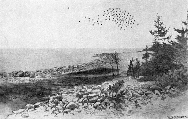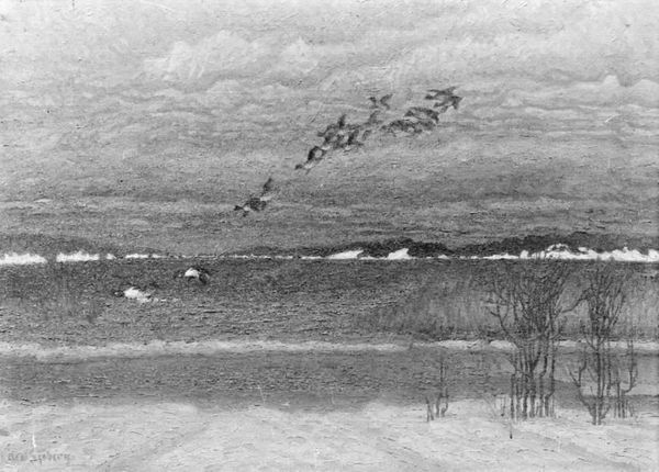 Theodor Severin Kittelsen created "Vision" using crayon and pencil to produce this monochromatic image. Kittelsen lived during a time of burgeoning Norwegian nationalism, as Norway sought independence from Sweden. In "Vision", the flocks of birds draw our eyes upwards. This sense of ascending vision evokes the spiritual and cultural revival that was occurring in Norway, which sought to rediscover its folklore, identity, and cultural independence. The birds could represent the souls of the ancestors or the nation's cultural heritage. Kittelsen's personal life was marked by financial struggles, health issues, and social isolation, perhaps why he found refuge in the wilderness, identifying with the marginalized aspects of nature. He once wrote "I was overcome by such profound sadness, a longing to leave, to journey far away." The picture offers a meditative space where personal emotional experience meets larger cultural narratives. It allows one to reflect on how individual identity is interwoven with collective aspirations.