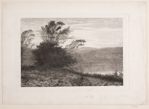 Curator: Vilhelm Kyhn created this print, entitled "Rye sø," in 1891. It is rendered as an etching. Editor: It’s melancholic, wouldn’t you say? A subdued tonality. Curator: Considering its historical context, Kyhn's commitment to Realism becomes quite significant. We see a distinct shift from the grand Romantic landscapes to something more immediate and relatable, don’t you think? Editor: Absolutely. This aesthetic reflected broader socio-political currents of the time. Landscape art in Kyhn's era wasn’t merely about depicting pretty scenes; it played a crucial role in shaping national identity. I’m curious about the choice of printmaking as a medium—an etching. Why not painting? Curator: Printmaking democratized artmaking and dissemination, and allowed works to be reproduced and widely distributed, giving Kyhn’s artwork greater circulation than a single canvas ever could. But tell me more about why you call this print “melancholic”? Editor: Note the subtle tonal variations in the etching—how the delicate rendering of light and shadow produces such a muted, thoughtful composition. You could also consider the subject. He didn’t select grand cliffs, but an isolated lake; the scale suggests humanity's relatively small impact upon the earth. Curator: And of course we must mention the craft of it, the marks etched and impressed, demanding certain sorts of physical labour but also inviting a type of reproduction. Its value resides both in the labor of the artist, as well as the democratic multiplication of prints to be distributed at affordable rates. Editor: Precisely, there’s a complex relationship here between the subject matter and the means of production, isn't there? Kyhn positions us in this place. How we approach the role of nature. Curator: Fascinating how this print allows us to contemplate not only the artistic decisions behind its creation but also the broader societal shifts of its time. Editor: A small work that nevertheless encompasses significant artistic and socio-political depth.
