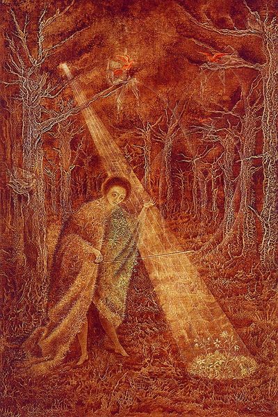Edward Robert Hughes made this painting, Fantasy in Twilight, with oils on canvas, though the date is unknown. The way the light dances in this piece feels so intuitive. It's like he's not just depicting a scene, but also the very act of seeing, and how seeing can be believing. The palette, all twilight blues and dreamy oranges, sets the stage for something magical, a real process-oriented approach to artmaking. The texture he achieves is incredible. It's as if the paint itself is alive, thick in places and thin in others, creating this shimmering effect. Look at the way he renders the flock of spirits in the background: they are not clearly defined figures, but a wash of light. It is a bit like Turner, isn’t it? This emphasis on color and light pulls us into Hughes’s world, where reality and fantasy blur. Ultimately, Hughes understands art as this ongoing conversation, more open than any one meaning could contain.