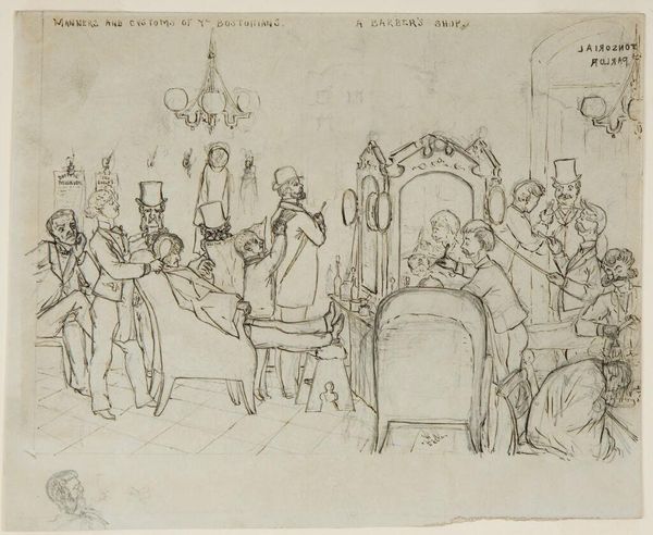 Editor: This is Francis Gilbert Attwood's "A Prospecte of Parker Hys House, from 'Manners and Customs of Ye Bostonians.'" It's a small ink drawing packed with figures. What strikes me is the sheer density of people in what appears to be a public dining space. What do you see in this piece? Curator: The density is key. Attwood’s sketch captures a specific moment in Boston's social history, likely satirizing the exclusivity of Parker House. Do you think this is straightforward documentation or something more? Editor: I see the caricature in the figures, so definitely satire. Curator: Exactly. This image participates in a larger discourse about class and social mobility in late 19th-century Boston. The “manners and customs” are being observed, and judged. Editor: I never thought about it that way, but that makes so much sense. The drawing style feels like a commentary in itself. Curator: Precisely. Art becomes a record and a critique of societal dynamics.