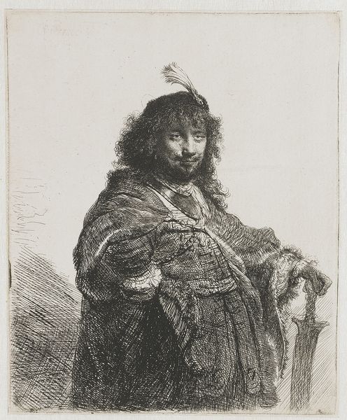 Curator: Here we have Rembrandt van Rijn's etching, "Rembrandt's Mother in Widow's Dress and Black Gloves," dating from about 1632 to 1635. It's a small but impactful portrait. Editor: My first thought? Quiet sorrow. There's something so intensely private in her gaze, like we've stumbled upon a very personal moment. All that black ink… it’s heavy with grief. Curator: Indeed. The work relies heavily on the intaglio technique. Observe the density and directionality of the etched lines. See how Rembrandt uses the fineness of the lines to delineate the textures of her garments, specifically the intricate lace and fur. Note also, how the composition is designed to move our attention towards her face, even though we can notice how much darker are her cloths. Editor: It's almost like he’s built her out of shadows. Each stroke tells a story, and combined, they make a world around her. What's amazing, if you look at the gloves, there’s a vulnerability that you do not find easily anywhere else. Do you know what I mean? And that expression, it captures a universal feeling, that loss of light in a human being, so close. Curator: It's the light that creates form. The play of light and shadow, which we, of course, know Rembrandt to be so adept with. That interplay really allows the etching to define the planes of the figure. Notice how this technique helps in expressing volume. It truly is amazing. The stark contrast between the lightness of the paper and the black of the ink makes it dramatic. It does create, however, some optical illusions due to the many lines used. Editor: It is, in some ways, an illusion. That's the beauty of art, isn't it? Taking something fleeting and trying to capture it. And to think this etching is what, almost 400 years old? It feels like it was pulled from my own memories. My great-grandmother, when I think of this image, it reminds me exactly of that feeling. And I can not feel otherwise! Curator: Time collapses when art allows such profound connection. Her face and garb exemplify, of course, some aspects of Baroque art. It allows you to connect your emotional responses, personal context and also this sense of timelessness. Editor: It does invite all that. Thank you! I can’t believe how those lines make her pop into a soul, almost touchable. Really makes me think differently about how an artist tells a story only with shapes, shade, and light!