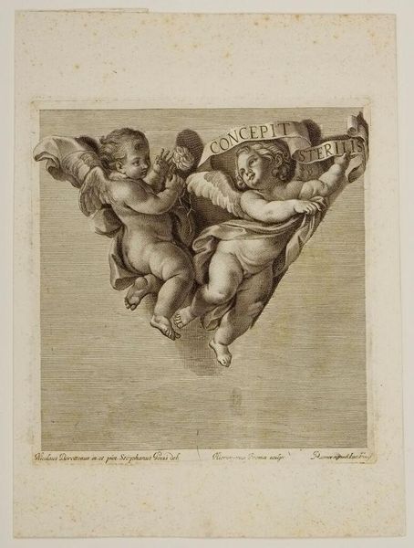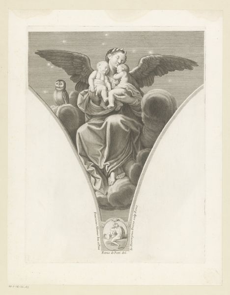 Editor: Here we have Giovanni Girolamo Frezza’s “Night,” undated, at the Harvard Art Museums. It’s an intriguing image, and I immediately notice the owl, a traditional symbol of wisdom, perched near the winged figure of Night. What other symbolic meanings are at play here? Curator: The prevalence of the owl indeed keys us into nocturnal wisdom. But consider also Night as a maternal figure, cradling the twins Sleep and Death, an ancient theme. Note the stars overhead; night is not merely absence of light, but a domain of celestial wonder, mirroring our inner cosmos. Editor: So the comfort and the terror of the night, side by side? Curator: Precisely. It reminds us how deeply intertwined these concepts have been in our cultural imagination. Night is a container for both dreams and the unknown. Editor: I hadn't considered the dual nature of these symbols. Thank you. Curator: My pleasure. It's in these visual echoes across time that art truly speaks.
