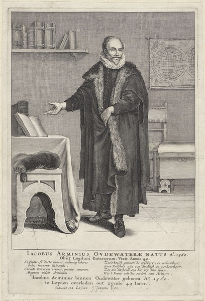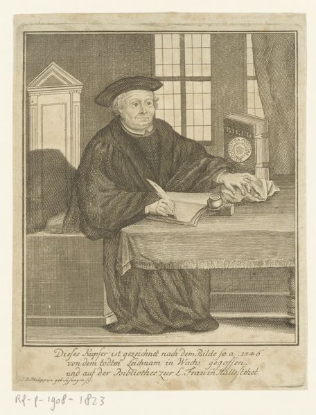Curator: Let's turn our attention to this engraving titled "Portret van Martin Luther." The work dates to sometime between 1602 and 1652 and is attributed to Françoçois Stuerhelt. Editor: It's immediately striking! The level of detail achieved through the engraving technique is impressive. There’s a strong sense of gravitas about him, despite what appears to be an almost caricatured appearance. Curator: Observe how Stuerhelt masterfully employs line variation to create a sense of volume and texture. Notice how the dense, cross-hatched lines give weight to Luther’s robes, in contrast to the more delicate lines used to depict the drapery and the books on the desk. The interplay between light and shadow creates depth. Editor: Yes, and beyond the purely formal, look at the symbols embedded within. The swan, for example, a common symbol for Luther, represents his steadfast adherence to the truth, or the truth of scripture as he saw it. The book, emblazoned with "Biblia", is obviously indicative of the centrality of scripture to the reformation. Curator: Precisely. Consider the formal implications of these iconic inclusions. The swan mirrors the curve of the drapery, creating a visual echo within the composition that anchors Luther's presence. Likewise, the angle and positioning of the “Biblia” seem to suggest its vital foundational importance. Editor: The portrait then, isn’t just a record of physical appearance; it's a statement about his beliefs, his theological positions, and indeed his legacy. I'm curious about that window—is that meant to represent intellectual or spiritual clarity? Curator: I would agree, and again, we see that reflected in the structure, how it invites light that then floods the face of Luther as the clear focus point. Editor: A brilliant encapsulation of a pivotal figure through skilled formal technique interwoven with historical, cultural, and, dare I say, emotional resonance. Curator: Indeed. A composition to reflect upon and consider the myriad components at play.