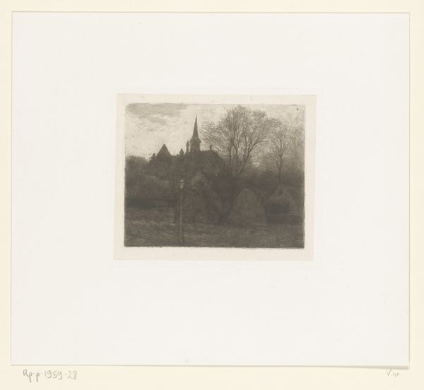 Alfred Elsen created this etching entitled "Landschap met boerderijen bij avond" sometime between 1850 and 1914. It is a study in contrasts, where light and shadow play against the linear structures of the landscape, and the textures of the buildings. The composition draws us in through a carefully structured arrangement of shapes and lines. Notice how the horizon divides the landscape into distinct zones, the lower zone being the detailed foreground with the buildings. The artist's meticulous lines create texture and depth. The dark shades of the trees are set against the paler sky to evoke a sense of evening tranquility. Elsen's etching explores a dialogue between the seen and the unseen. In a semiotic sense, the buildings represent established structures and spaces, while the encroaching darkness hints at unseen forces. The artist challenges the conventional landscape by emphasizing the emotional and atmospheric rather than the purely representational. Ultimately, the etching's power lies in its ability to balance formal precision with evocative ambiguity, inviting us to interpret the rural evening according to our own perceptions.