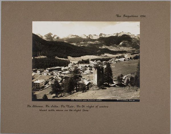 Editor: This black and white photograph, "Crastagüzza, Piz Bernina, Piz Morteratsch, Piz Misaun, The Engadine," by A. G. Wehrli, presents a stark mountain landscape. I’m struck by the small figures against the massive, snow-capped peaks. What stories do you think it's trying to tell? Curator: The figures remind us of our own smallness against the sublime. The structure, a human intervention, hints at shelter, resilience, and perhaps a shared purpose. In what ways do you see the peaks speaking to our cultural fascination with heights and the divine? Editor: That’s a great point! I hadn't considered the mountain peaks as symbols of aspiration. It makes me think about how landscapes can become powerful cultural symbols. Curator: Exactly! And it’s interesting to see how that symbolism is captured and reinterpreted through different artistic lenses across time. Editor: I will definitely look at landscape photography with fresh eyes from now on!